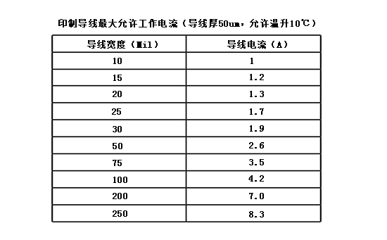 銅線的寬度應(yīng)根據(jù)其能承載的電流進(jìn)行設(shè)計(jì)。銅線的載流量取決于以下因素:線寬、導(dǎo)線厚度(銅鉑厚度)、允許溫升等。下表給出了銅線寬度、導(dǎo)線面積和導(dǎo)電電流(軍用標(biāo)準(zhǔn))之間的關(guān)系。根據(jù)這一基本關(guān)系,可以適當(dāng)考慮導(dǎo)線寬度。